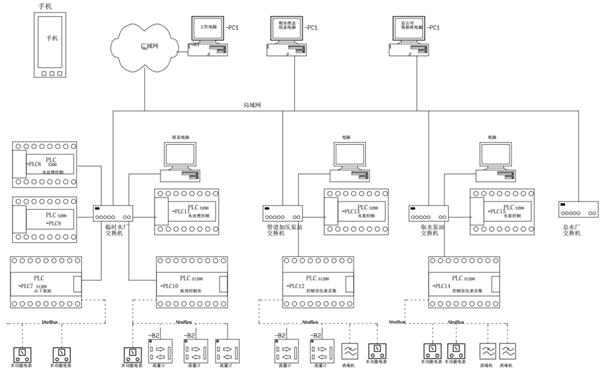 針對河源市勤誠達(dá)水務(wù)公司進(jìn)行智慧水務(wù)的智能控制系統(tǒng)的設(shè)計與實(shí)現(xiàn)。智慧水務(wù)的基礎(chǔ)是智能供水系統(tǒng),其內(nèi)容上層是組態(tài)軟及數(shù)據(jù)庫,下層是由PLC及各類儀表組成的多種子系統(tǒng),如取水提升泵站子系統(tǒng),制水池控制子系統(tǒng),配電房控制子系統(tǒng)、遠(yuǎn)程管路加壓站控制子系統(tǒng)、遠(yuǎn)程加藥控制子系統(tǒng)。這些子系統(tǒng)基于多種物理網(wǎng)絡(luò)及通訊協(xié)議,組成一個覆蓋范圍廣,能宏觀調(diào)控,有智能算法的智慧水務(wù)智能供水系統(tǒng)。